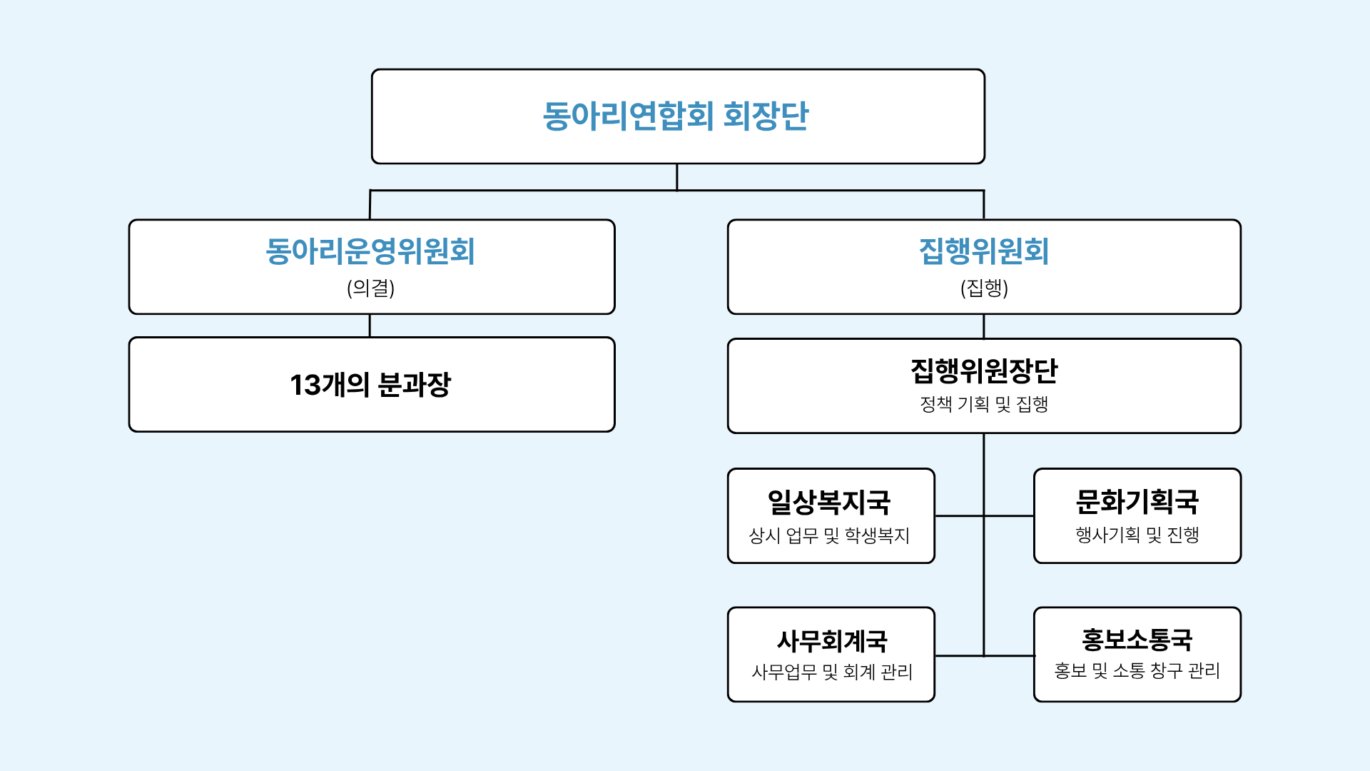동아리연합회는 회장단 산하의 동아리운영위원회와 집행위원회로 이루어져있습니다.